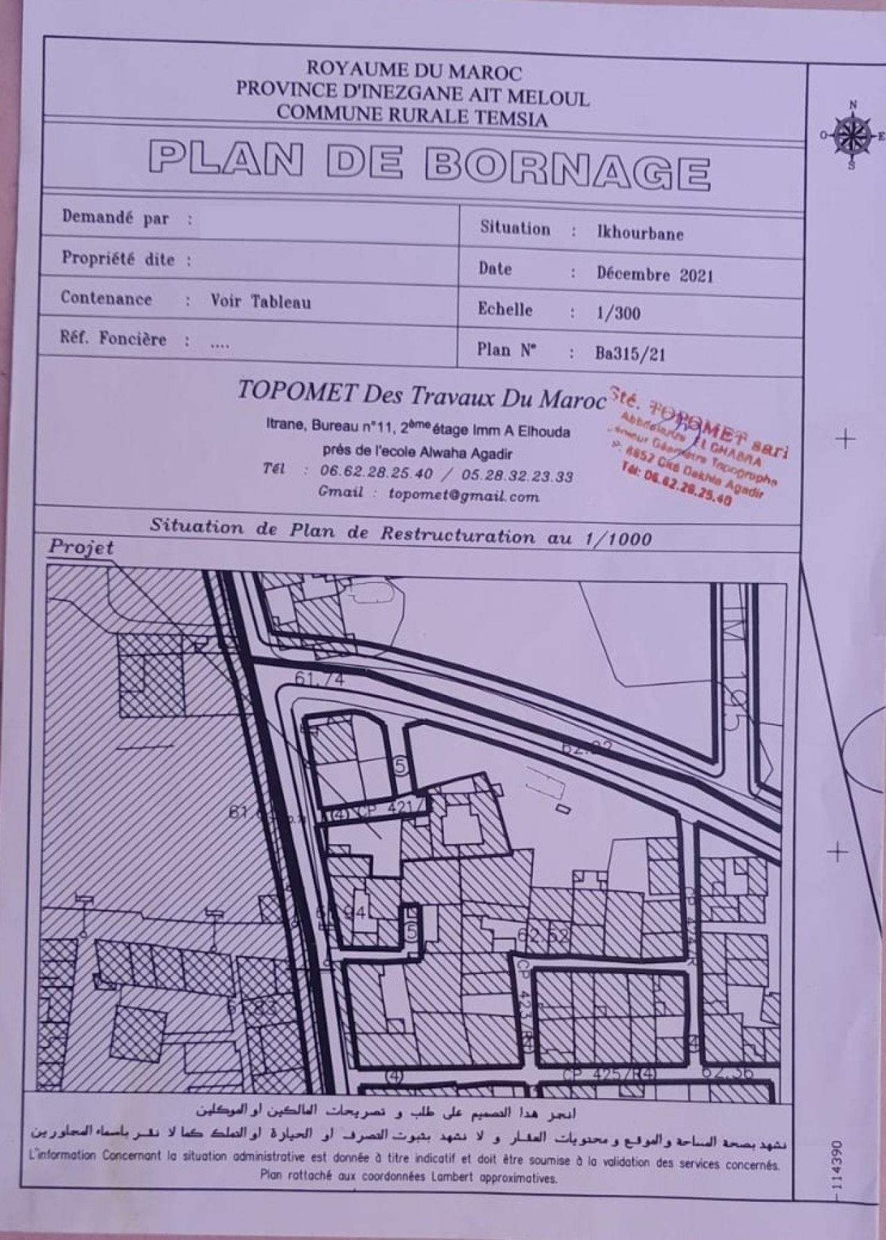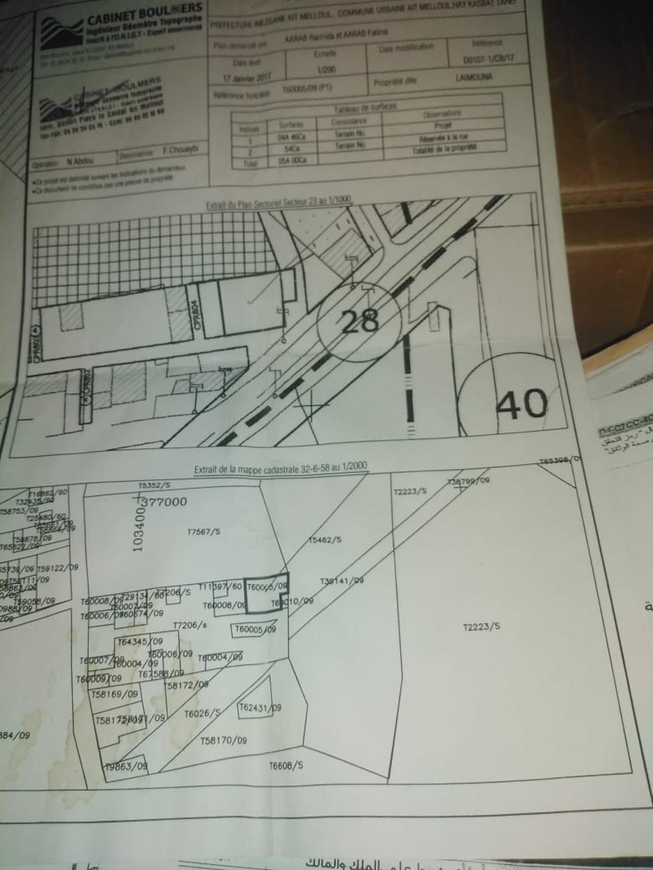 أيت ملول مركز – كراج مرسوم مساحته 253 م² للبيع. موقع استراتيجي، بواجهة مزدوجة، قابل للبناء طابق أرضي زائد 3 طوابق. مثالي للمستثمر ...