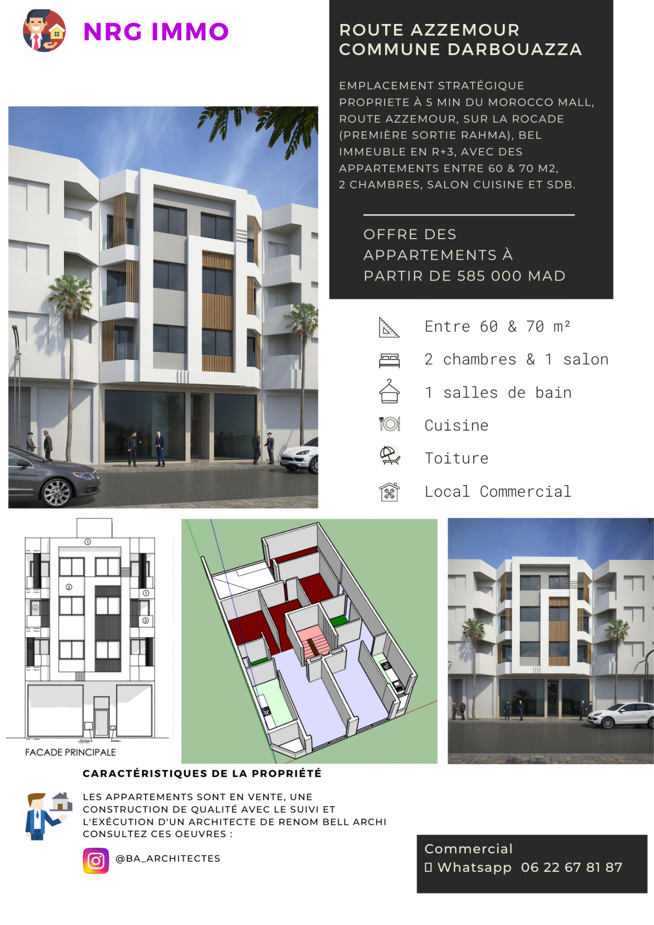 موقع استراتيجي ، طريق دربوازة الدائري مخرج رحمة في تقسيم مكون من 160 م 2. منح الإذن R + 3 ، بدروم ، دور أرضي ، ميزانين و 3 طوابق....