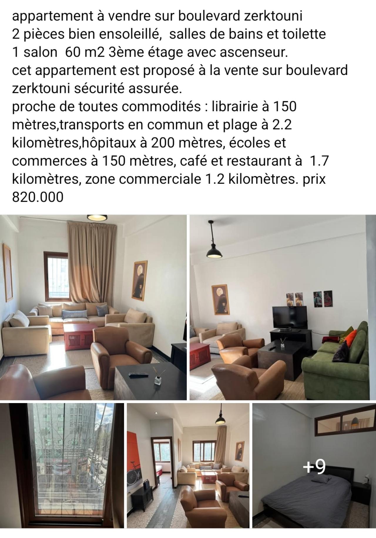 شقة للبيع بشارع الزرقطوني بالدار البيضاء بمساحة 60 م2 تقع في الطابق الثالث مع مصعد. الشقة مشمسة للغاية وتتكون من: - 2 قطعة - 1 ص...