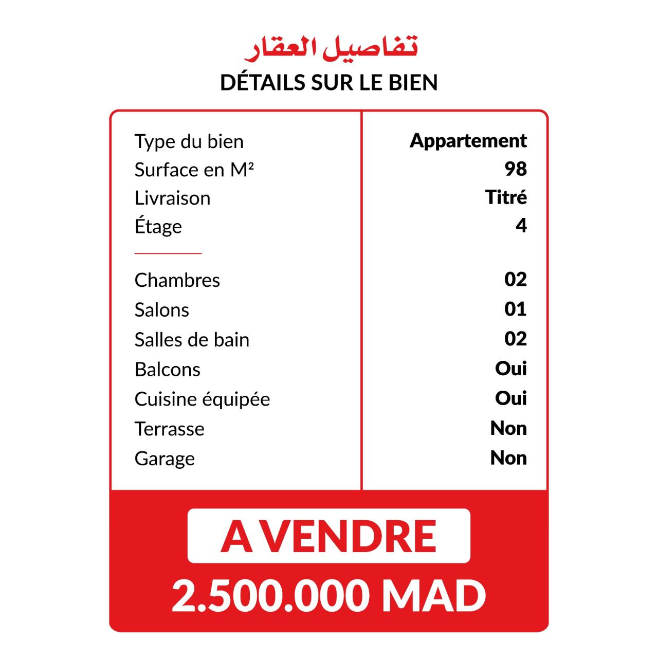 شقة مفروشة للبيع بمدينة طنجة، بمساحة مريحة تبلغ 98 مترًا مربعًا، تقع في الطابق الرابع داخل إقامة سكنية هادئة ومُعتنى بها جيدًا. ...