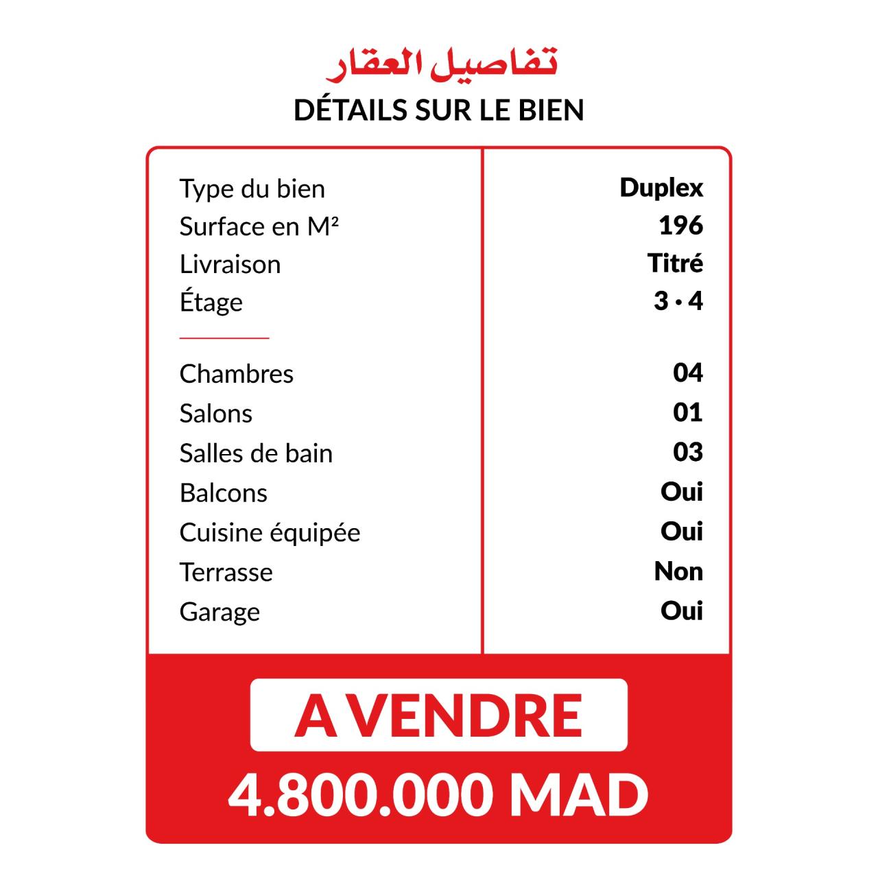 اكتشف هذا الدوبلكس بمساحة 196 متر مربع للبيع في طنجة، الواقع في قلب حي إيبيريا، في الطابقين الثالث والرابع من عمارة مزودة بمصعدين ...