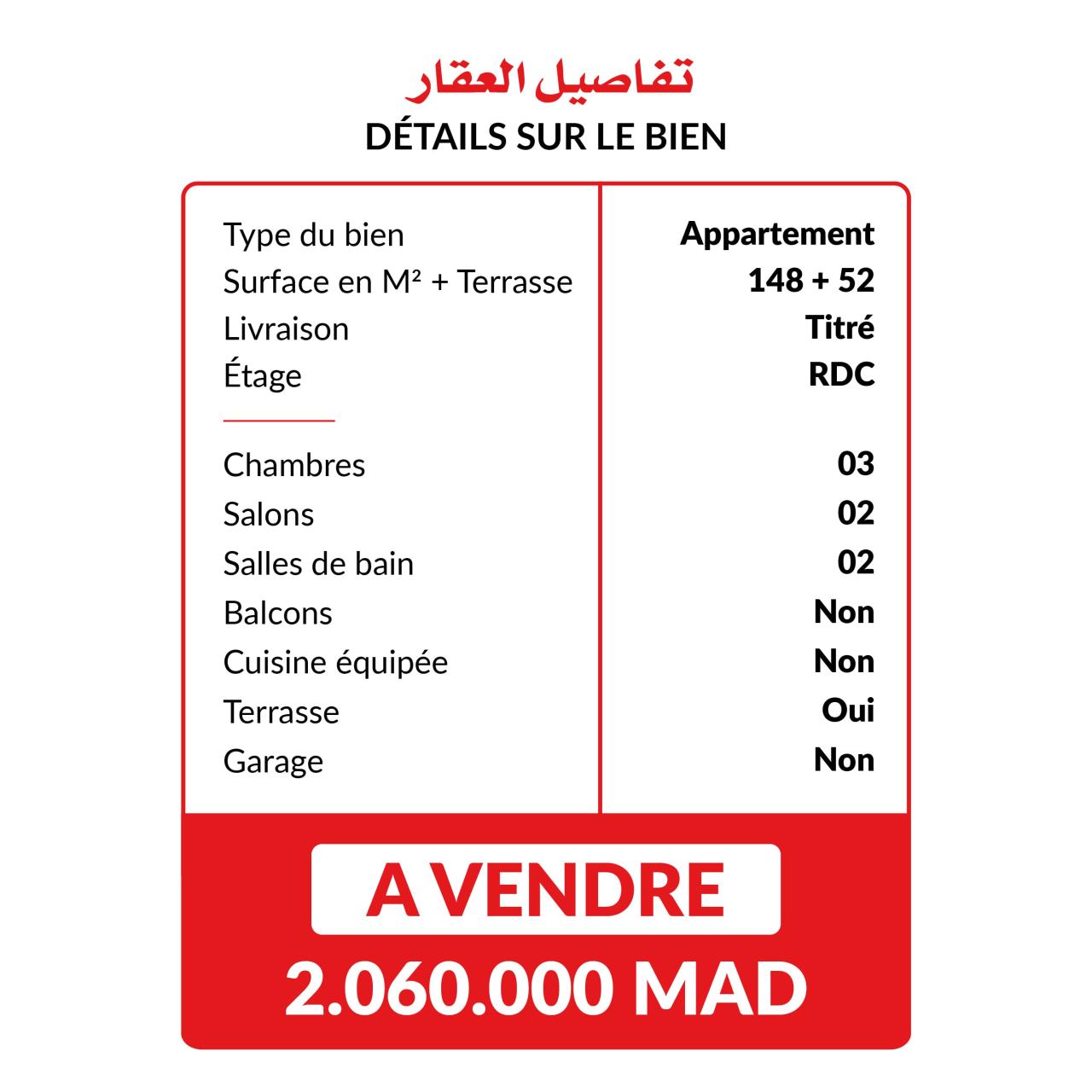 شقة للبيع في طنجة – الطابق الأرضي مع تراس كبير. شقة بمساحة 148 مترًا مربعًا للبيع في طنجة، تقع في الطابق الأرضي من العمارة، مع ...