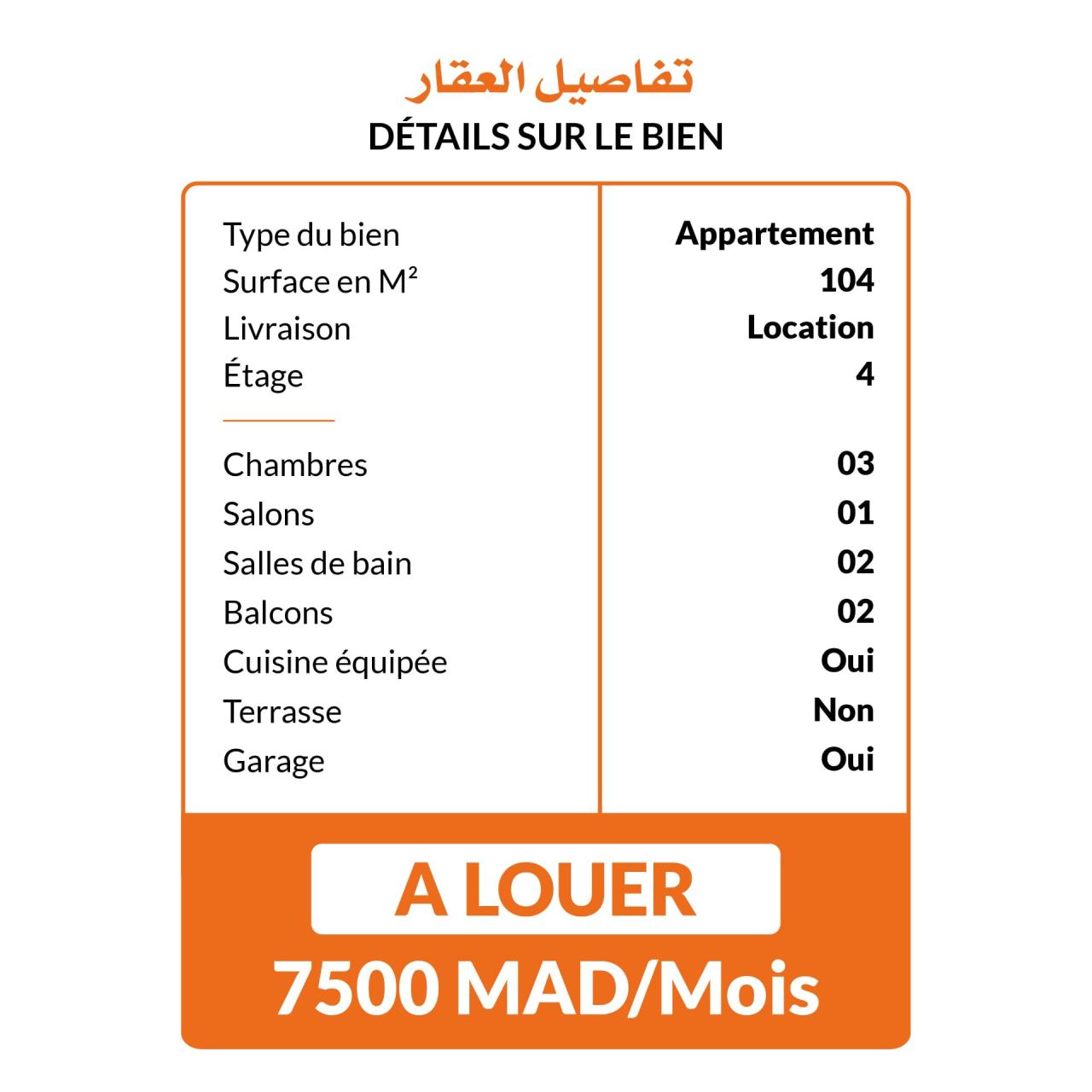 شقة (برطما) 4 غرف 65 م² طنجة « موزارت »