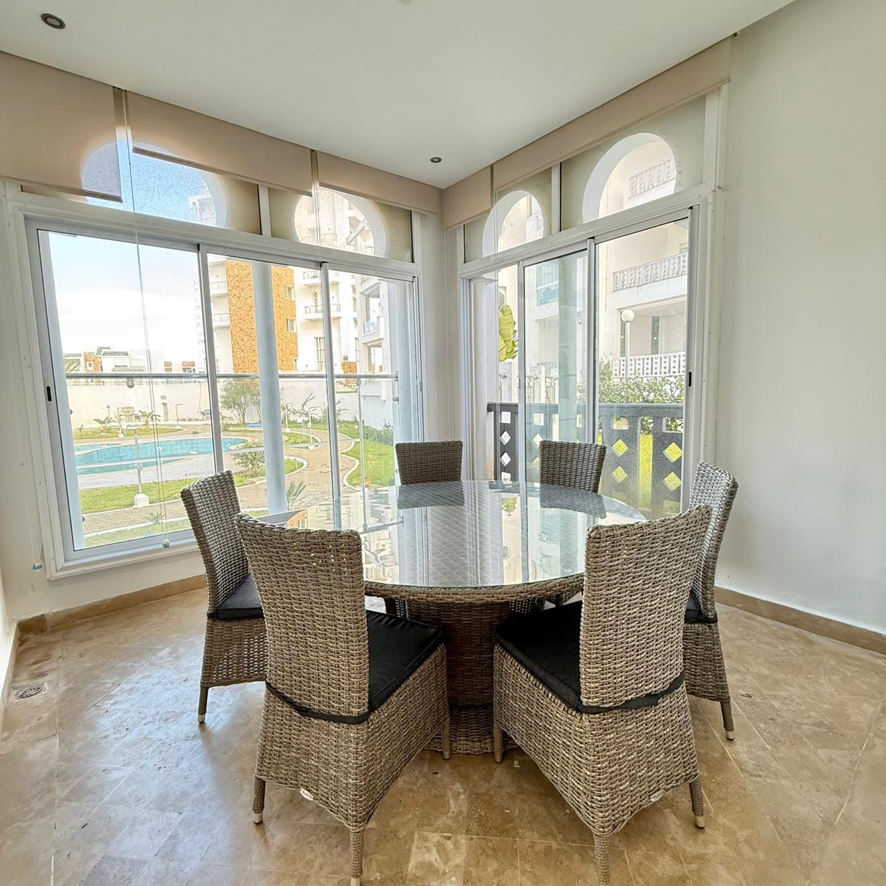 Appartement meublé de 110 m² à louer à Tanger, situé au rez-de-chaussée d’une résidence fermée. L’appartement offre une vue dég...