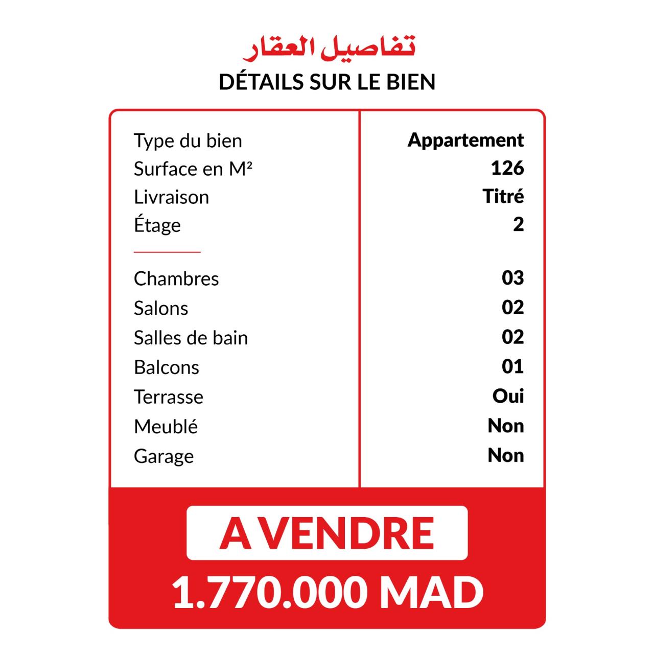 Appartement à vendre à Tanger, d’une superficie de 125 m², situé au 1ᵉ étage d’un immeuble moderne. Il se compose de : * 3 c...