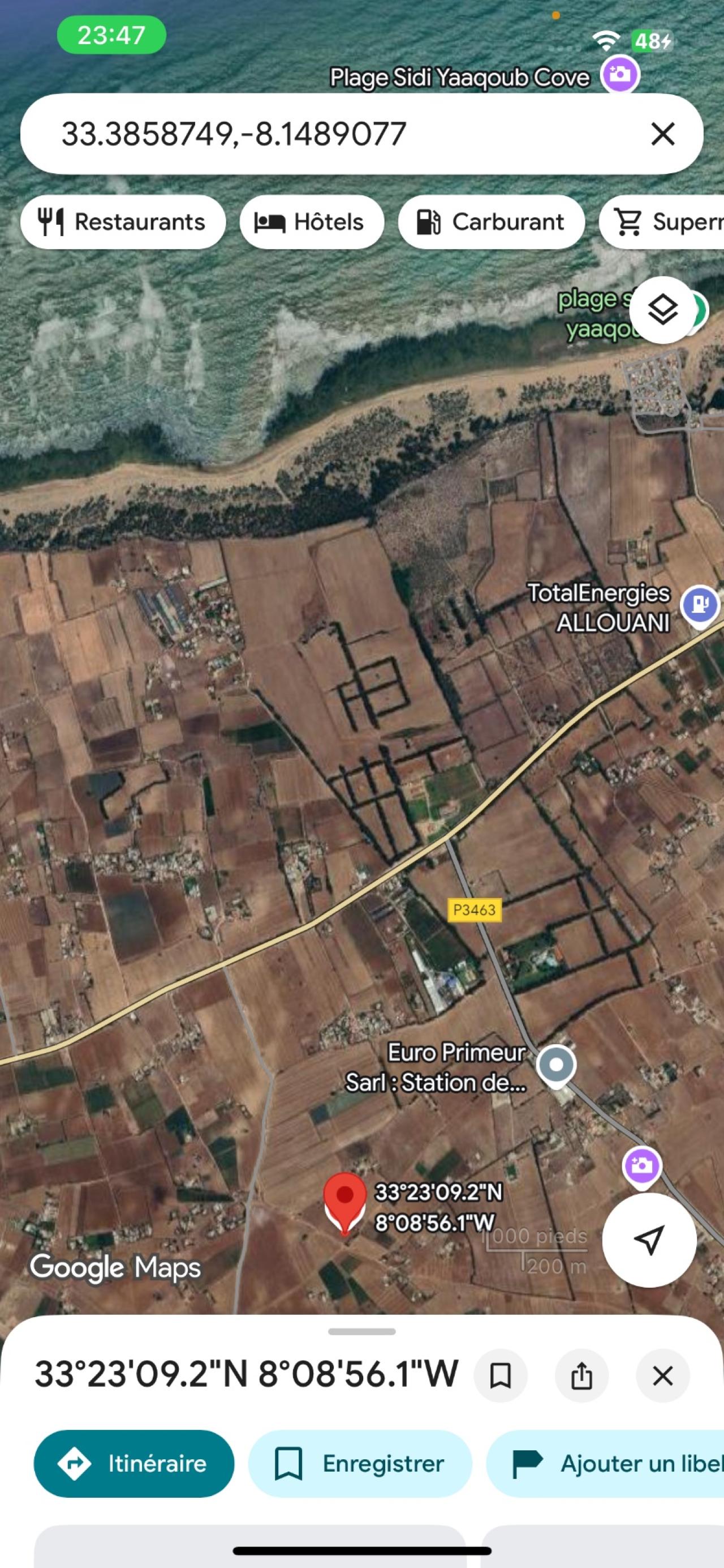 Terrain à vendre – El Jadida, face à la mer. Emplacement : Route Sidi Bouzid, en bord de mer Superficie : 5 hectares (3 titr...